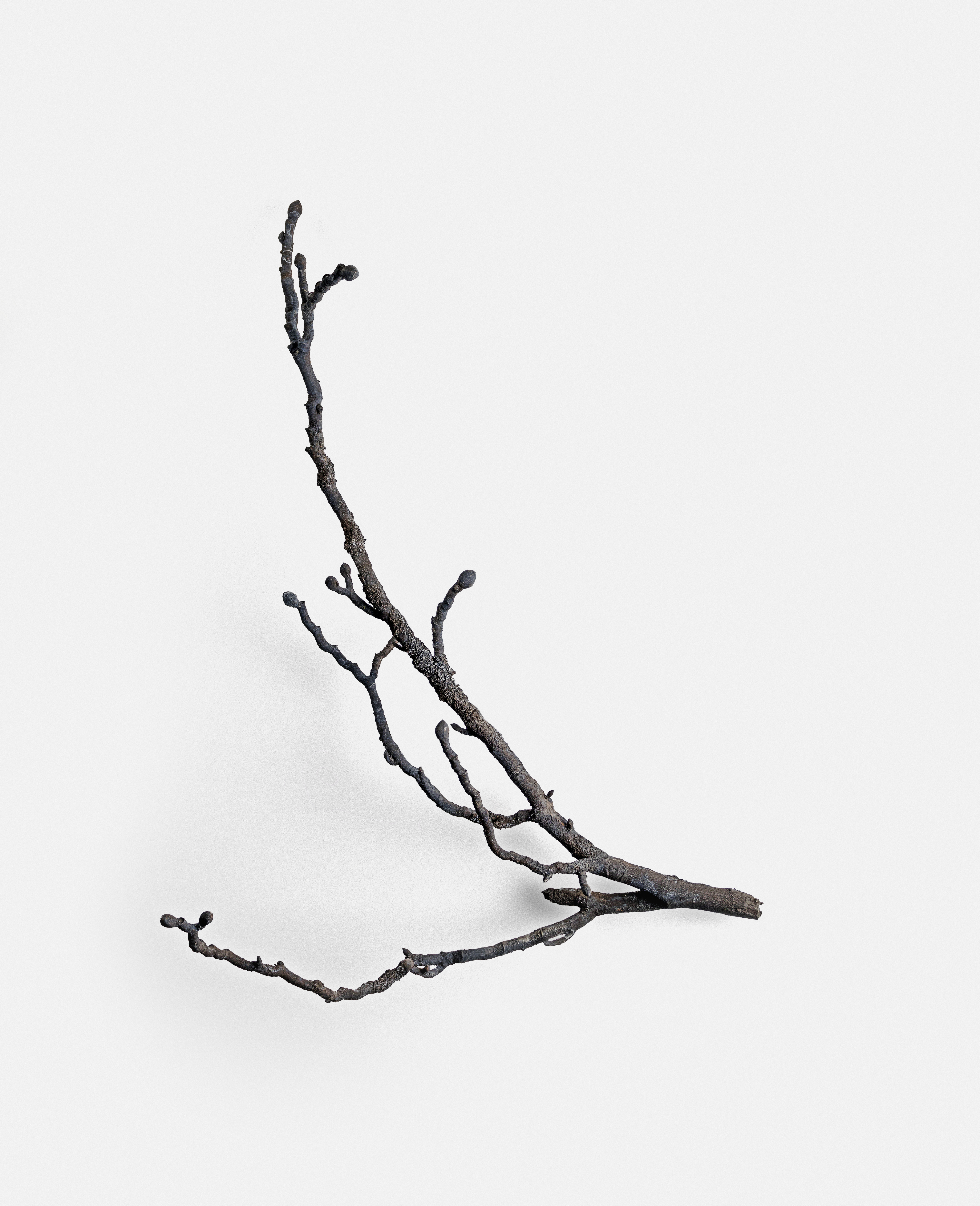 N 46 ° 54’ / E 6 ° 34' reinterprets the classical notion of a Readymade. In the manner of Duchamp, we let the viewer see a familiar, seemingly worthless object in a new context. The New Readymade must be desirable, question the initial object and add a value though this switching of contexts. Through a change in materiality the chestnut branches obtain a new lecture and thereby a new value. These fragile chestnut branches, found in Fleurier, in the region of Val-de-Travers, Switzerland were transformed by a traditional craftsman Gilles Petit into a completely different material - bronze. Through the passage of time, the patina changes and lets the object age gracefully. Once mounted on the wall, these branches – natural readymades, become poetic coat racks.