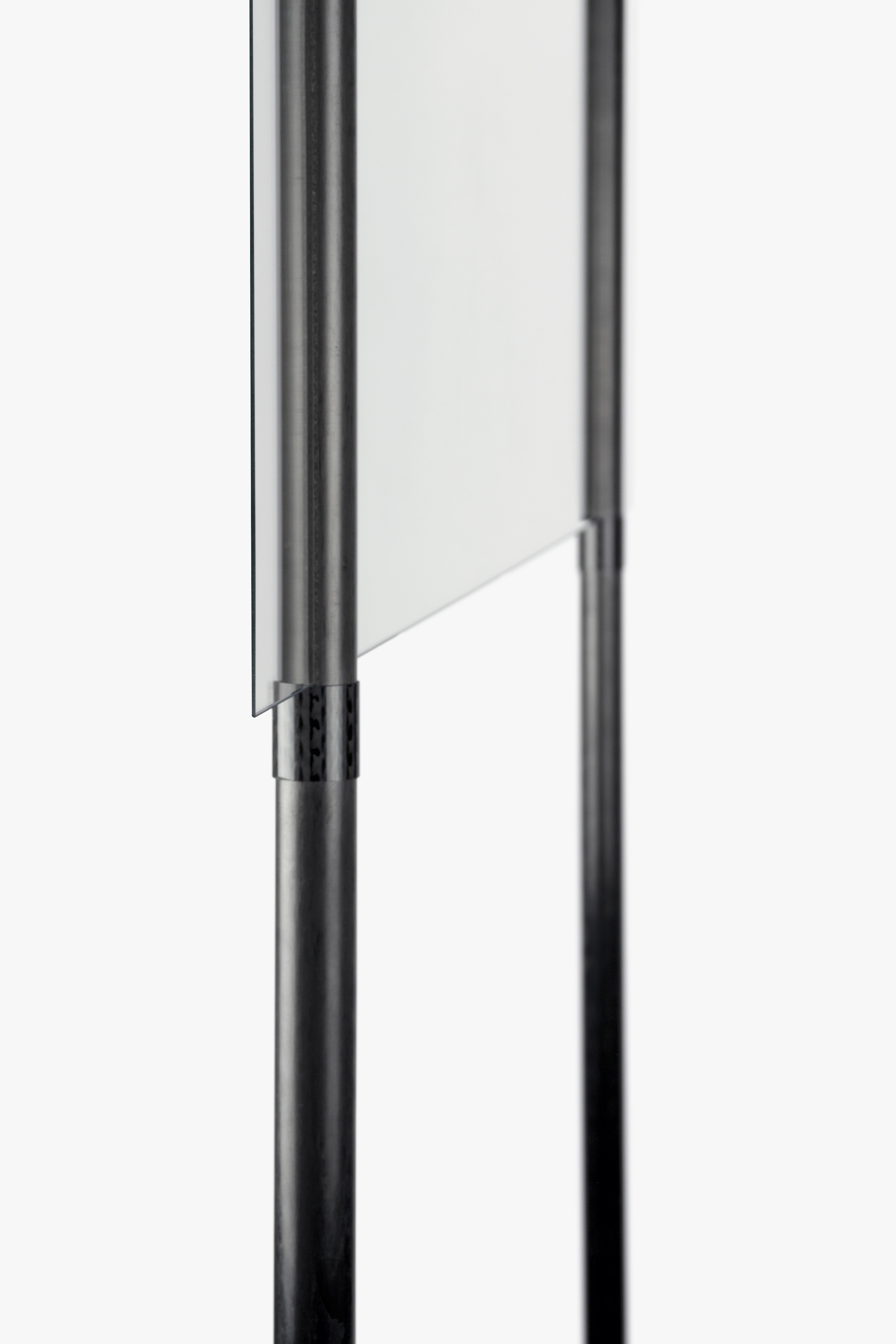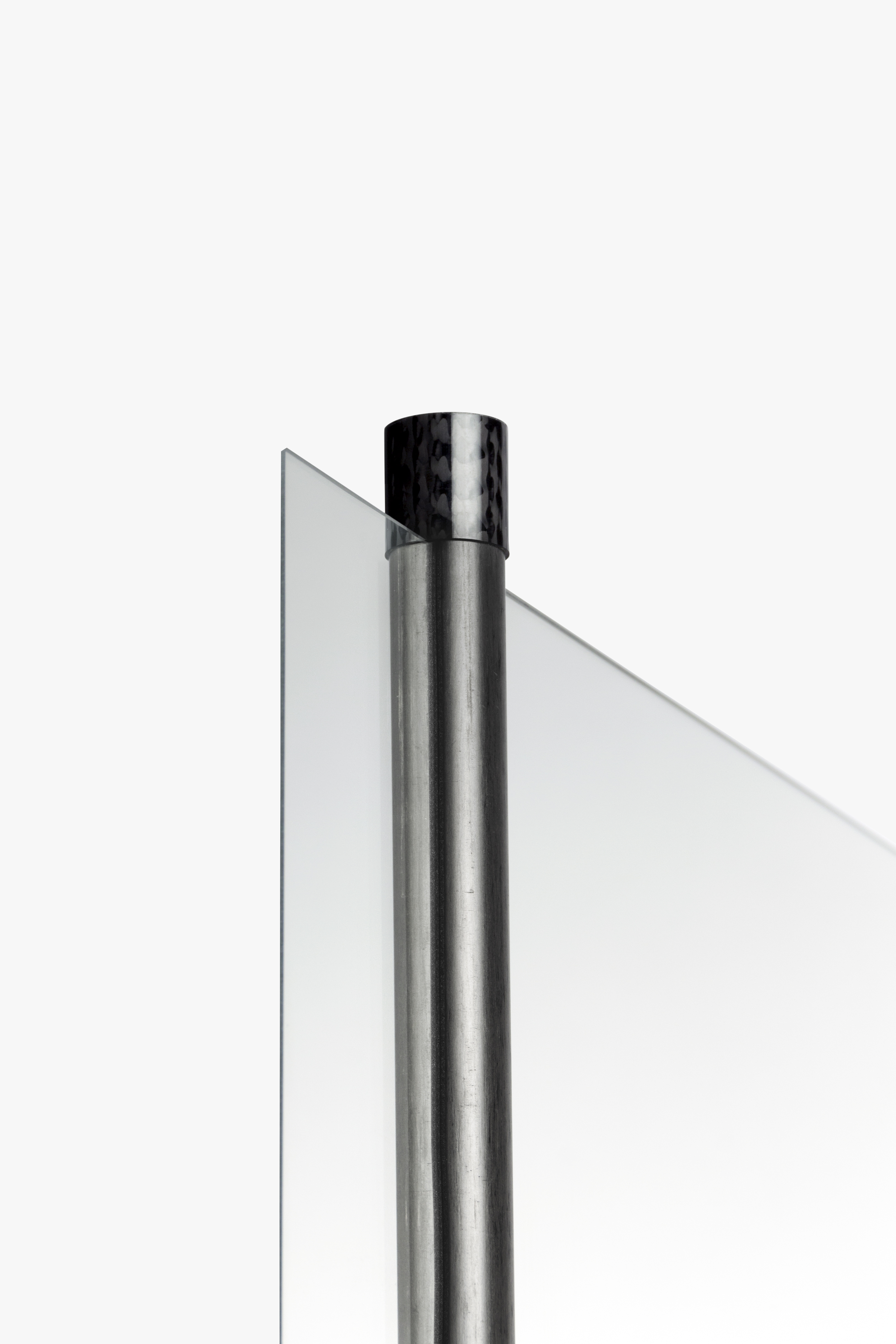 Reflexion is mirror which surprises by its thinness of 0.7mm and a weight of mere 600g. Its aesthetics are defined by the industrial feasibility without obsolete work steps, challenging the limits of the industrial production. The mirroring panel is made out of Gorilla Glass®, a cutting-edge material, which is on one hand extremely scratch-resistant and on the other makes an unprecedented ratio between surface size, thinness and rigidity possible. The carbon fibre rods support the mirror in a slender manner and finally a solid stone base anchors the structure on the ground. The value of the chosen materials is based on their production costs and capabilities, resulting in a piece defined by it’s constraints. The object is a mechanical ready-made, defining the future of luxury through the ultimate efficacy of the chosen materials.